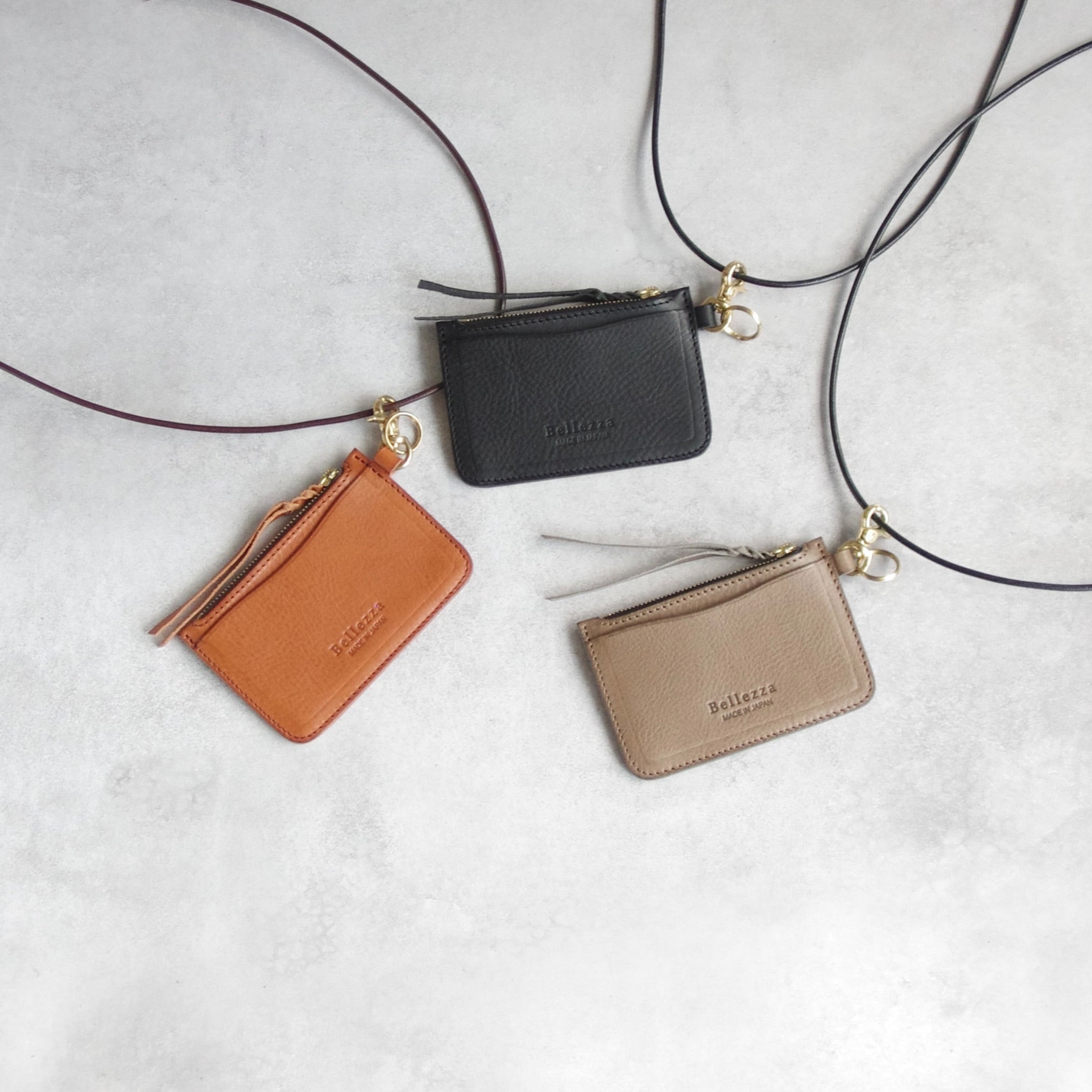 首から下げることを前提としたコンパクトなサイズ感のネックウォレットです。ストラップ部分は最長で約56cmの長さまで調節可能となっている為、首から下げたり肩掛けとお好みの長さでご使用いただけます。お札や小銭、数枚のカードをまとめて収納可能。