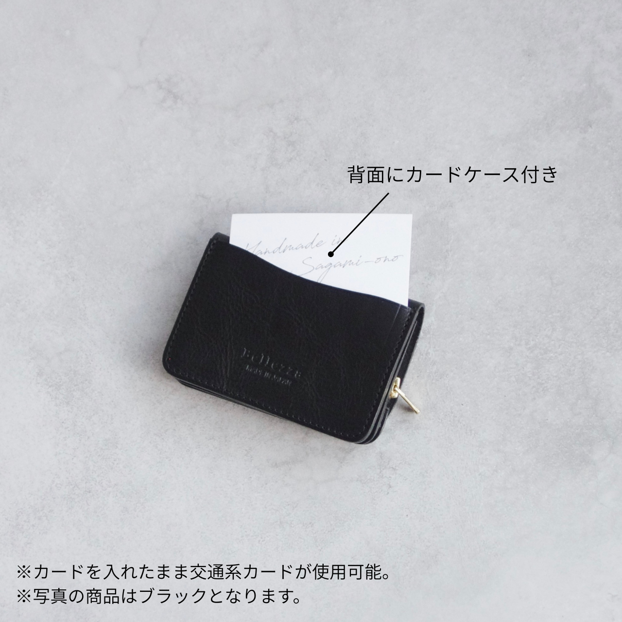 手のひらサイズのミニ財布です。真鍮製のギボシがアクセントになっていて、蓋を開けるとL字ファスナーの小銭入れ、カードはまとめて収納するタイプで約5〜10枚程が入れられます。お札は2つに折るか3つに折って収納します。背面のカードポケットは、カードを入れたまま交通系カードが使用可能。男女問わずお使いいただけ、流行りに捉われないデザインは末永くご愛用いただけます。