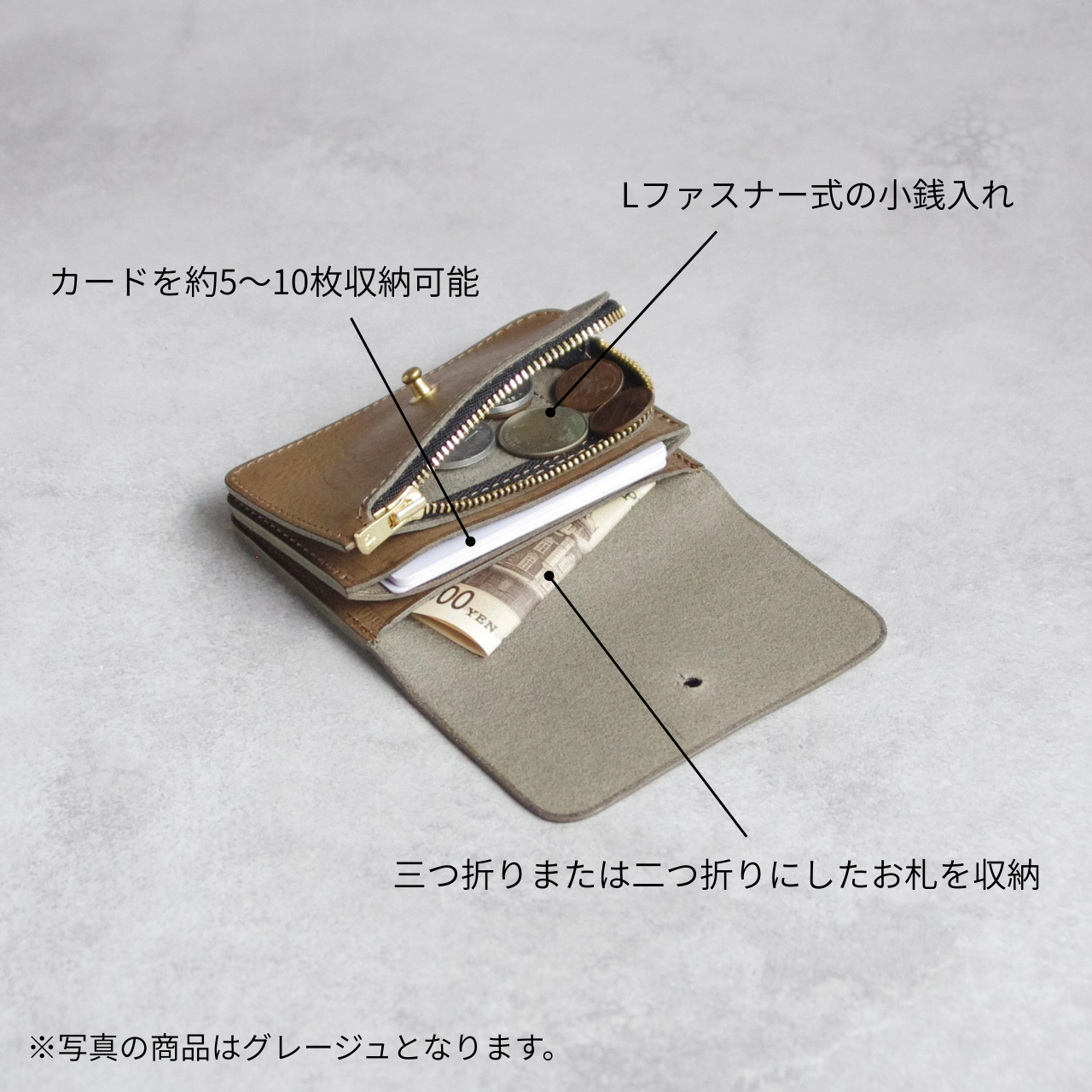 手のひらサイズのミニ財布です。真鍮製のギボシがアクセントになっていて、蓋を開けるとL字ファスナーの小銭入れ、カードはまとめて収納するタイプで約5〜10枚程が入れられます。お札は2つに折るか3つに折って収納します。背面のカードポケットは、カードを入れたまま交通系カードが使用可能。男女問わずお使いいただけ、流行りに捉われないデザインで末永くご愛用いただけます。